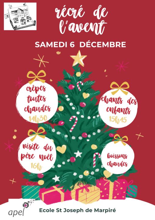 Ces portes ouvertes seront suivies par la récré de l’avent. Vos enfants seront attendus pour vous présenter leurs talents de chanteurs à partir de 15h30. Des chants par vos enfants vous seront proposés, suivis de l’arrivée du Père Noël. Une bonne crêpe toutes chaudes et une buvette vous seront également proposés.